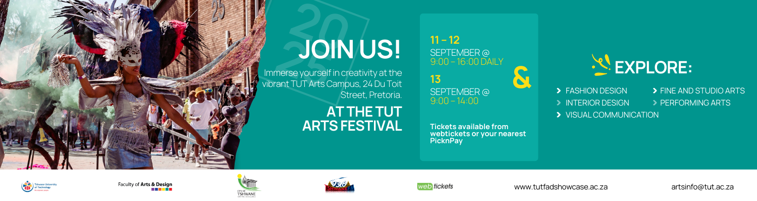 Visit www.tut.ac.za or www.tutfadshowcase.ac.za for updates, or email artsinfo@tut.ac.za for more information or to make your school bookings.